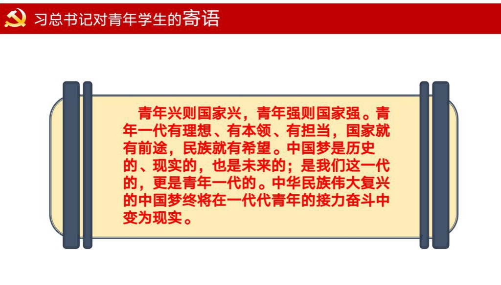 最后,杨老师将习总书记的一段话送给同学们,希望同学们时刻提醒自己:“青年兴则国家兴,青年强则国家强。青年一代有理想、有本领、有担当,国家就有前途,民族就有希望。中国梦是历史的、现实的,也是未来的;是我们这一代的,更是青年一代的。中华民族伟大复兴的中国梦终将在一代代青年的接力奋斗中变为现实。”