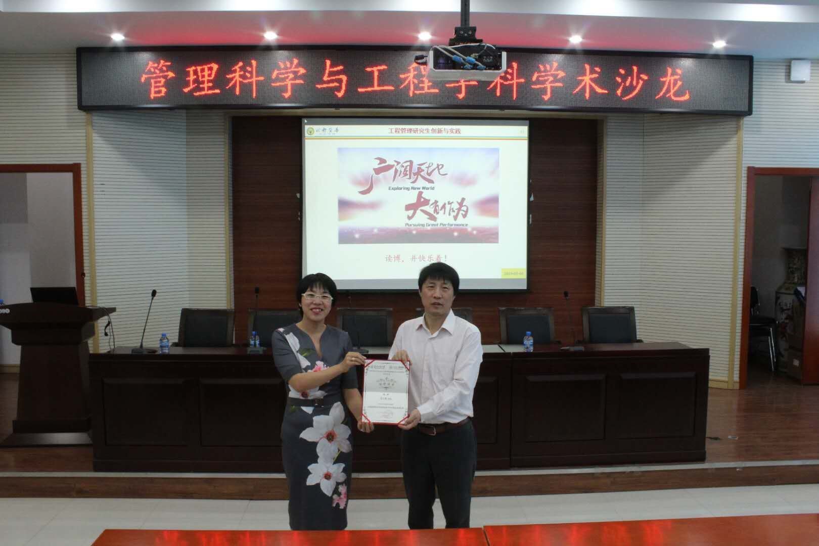 经过邓小鹏教授的讲解,同学们对工程管理研究生创新实践与自科基金申报有了更为深刻的认识和理解。同学们也针对报告的内容向专家提出了自己的疑问和思索,老师耐心的解答,让同学们收获良多。报告最后,刘洁老师为邓小鹏教授颁发了荣誉证书。至此,管理科学与工程学科第2期学术沙龙圆满结束!(图片作者:谭宪宇;文字作者:工程管理系学生会)