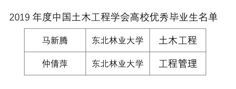 日前,2019年度中国土木工程学会高校优秀毕业生奖公布评选结果,我院毕业生马新腾、仲倩萍两名同学获此荣誉称号,全国仅有清华大学、东南大学和我校有两名同学获评。