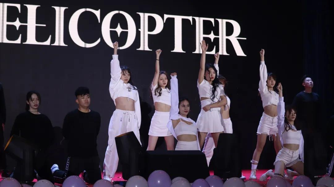 颈的轻摇,肩的微颤,一阵一阵的柔韧的蠕动,从右手的指尖,一直传到左手的指尖,可谓是“珠缨炫转星宿摇,花鬘斗薮龙蛇动”!街舞《helicopter》点燃全场。