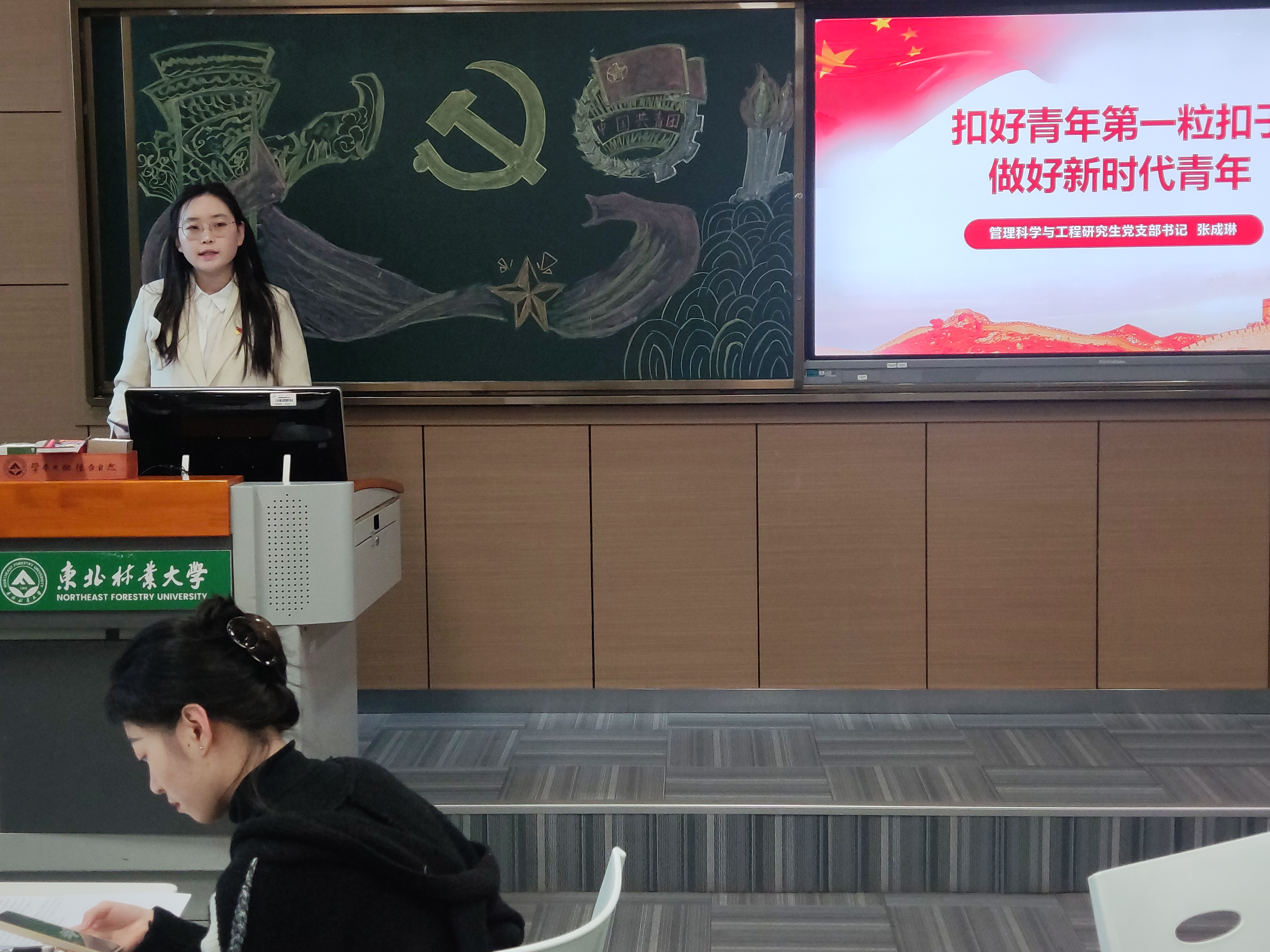 学习会通过视频“人生的第一粒扣子”导入,而后管理科学与工程研究生党支部书记张成琳围绕“如何扣好青年第一粒扣子,做好新时代青年”进行了分享。她从积极践行生态文明理念,大力弘扬塞罕坝精神、守护绿水青山,筑牢生态屏障,积极服务国家战略、立足龙江,为推进东北振兴、建设美丽中国多作贡献几个方面进行阐述。号召广大同学坚定理想信念,勇于创新实践,保持严谨的科研态度和探索精神,持续地学习和提高,以实际行动争做新时代好青年。