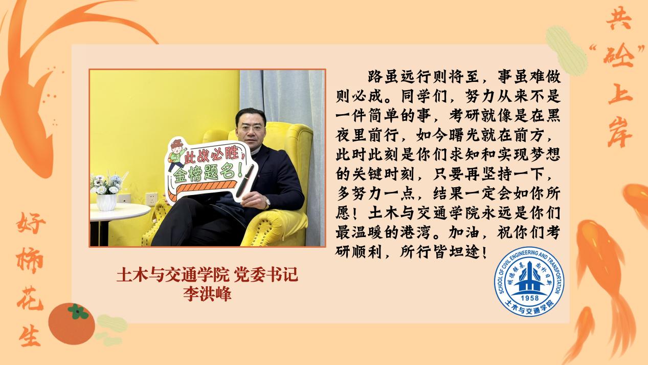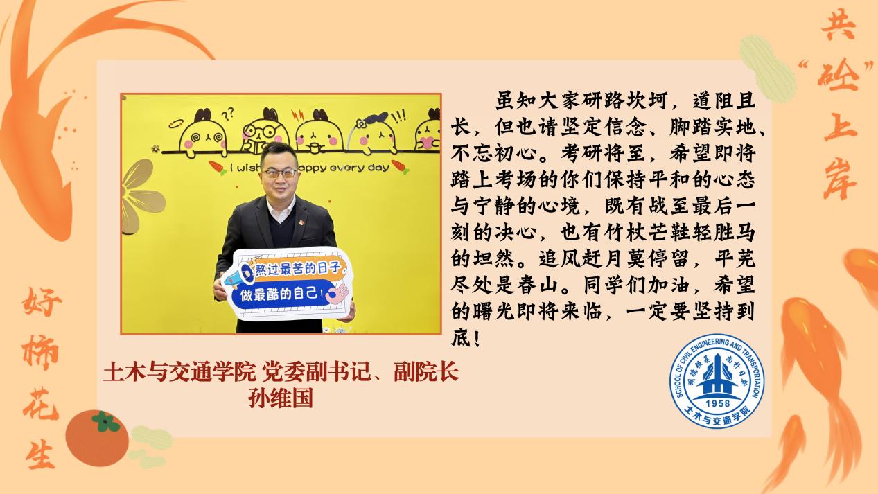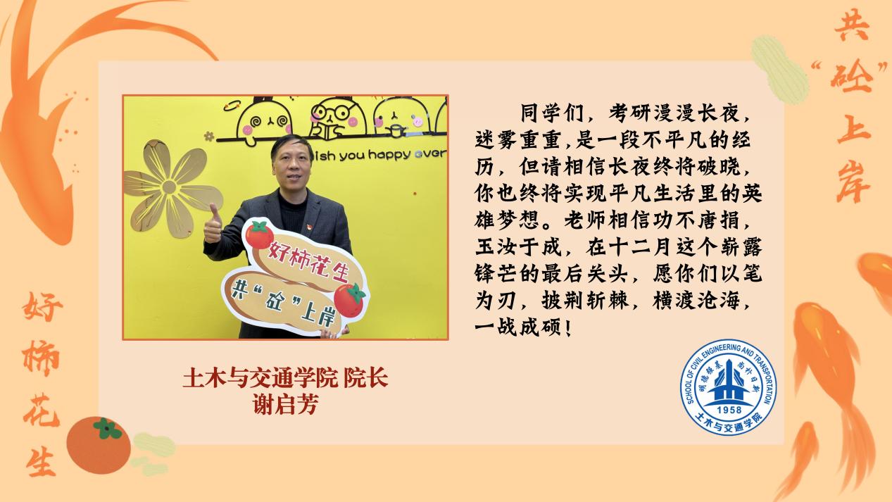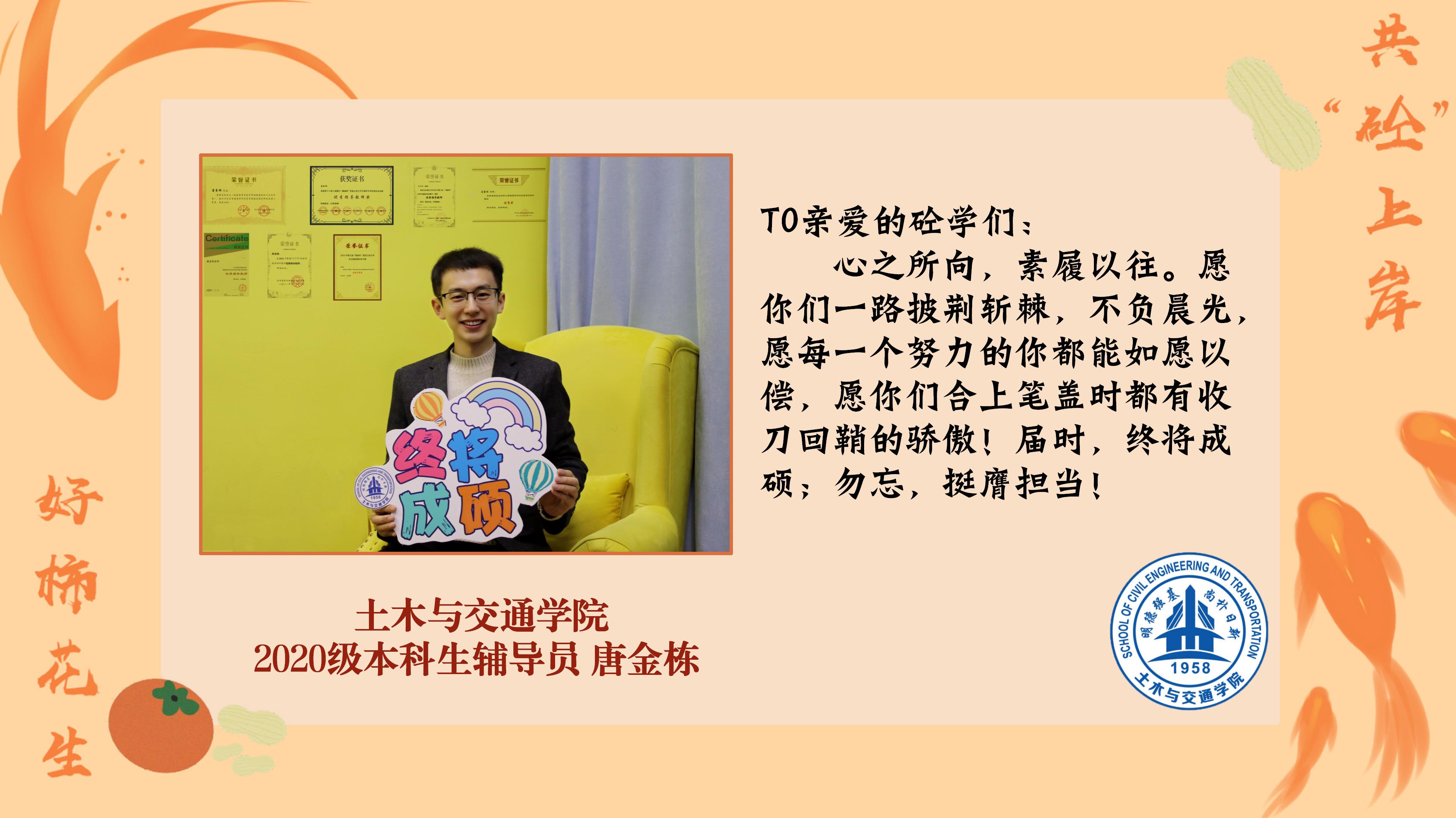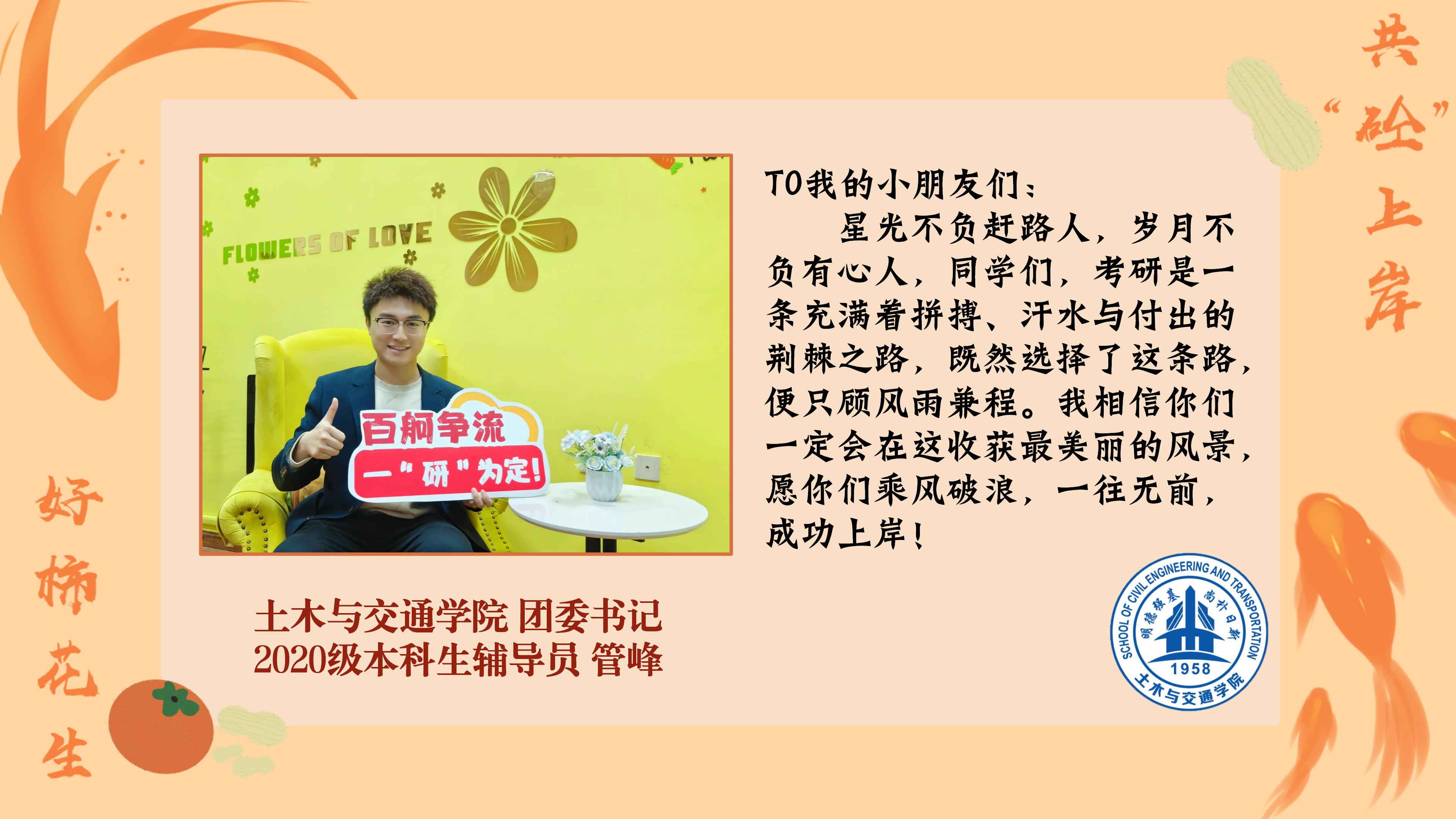 千帆竟过,百舸争流。考研路上,他们拼搏向上、锐意进取,他们有着“奋斗有我、追求无悔”的执着和“世上无难事,只要肯登攀”的坚韧,他们以实际行动践行着奋斗的青春最美丽,奋斗的人生最充实的信条。学院各位领导和毕业年级辅导员老师为大家准备了亲切的寄语,祝福所有考研学子旗开得胜,金榜题名!