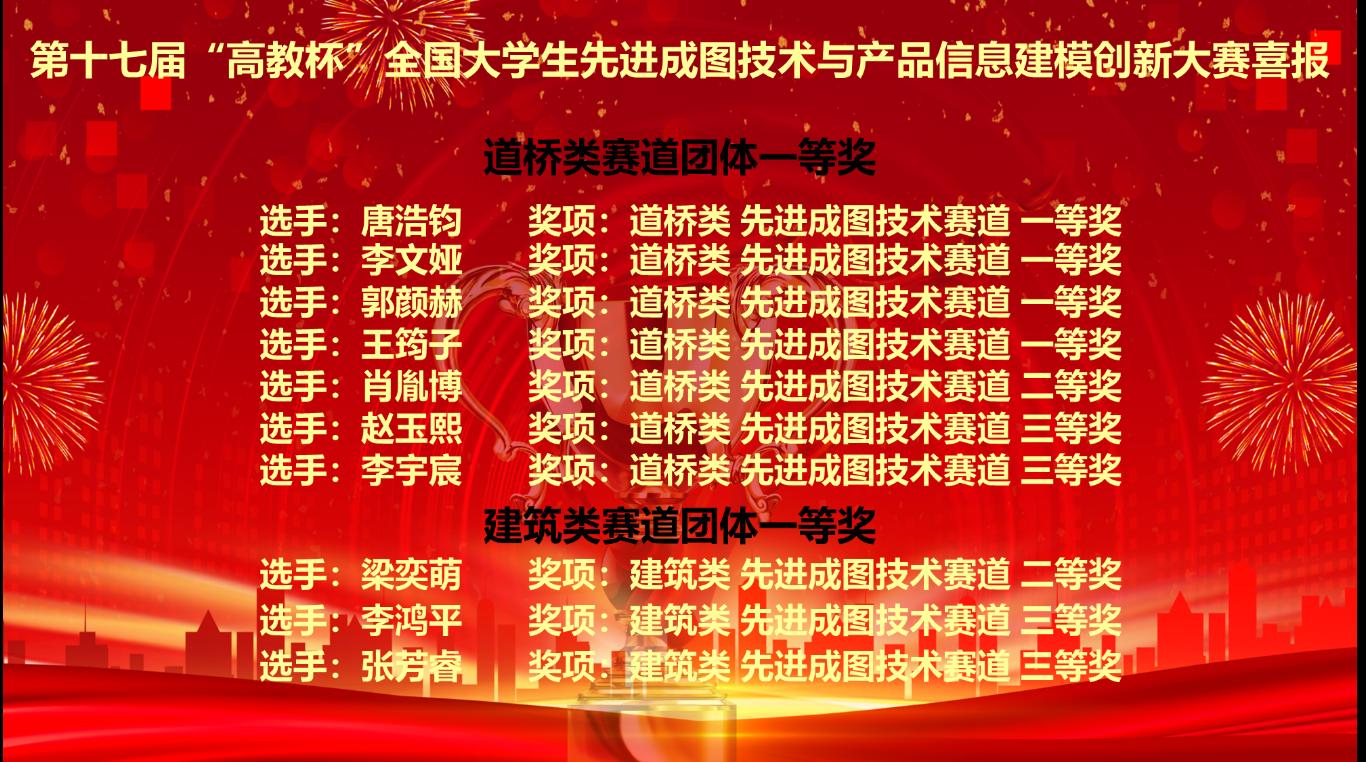 近日,第十七届“高教杯”全国大学生先进成图技术与产品信息建模创新大赛在贵州大学举行,我校Betway体育西汉姆联学子在道桥、建筑两个赛道获得一等奖4项、二等奖2项、三等奖4项,并分别获得团体一等奖,充分展示了东林学子的动手能力、创新意识和协作精神。