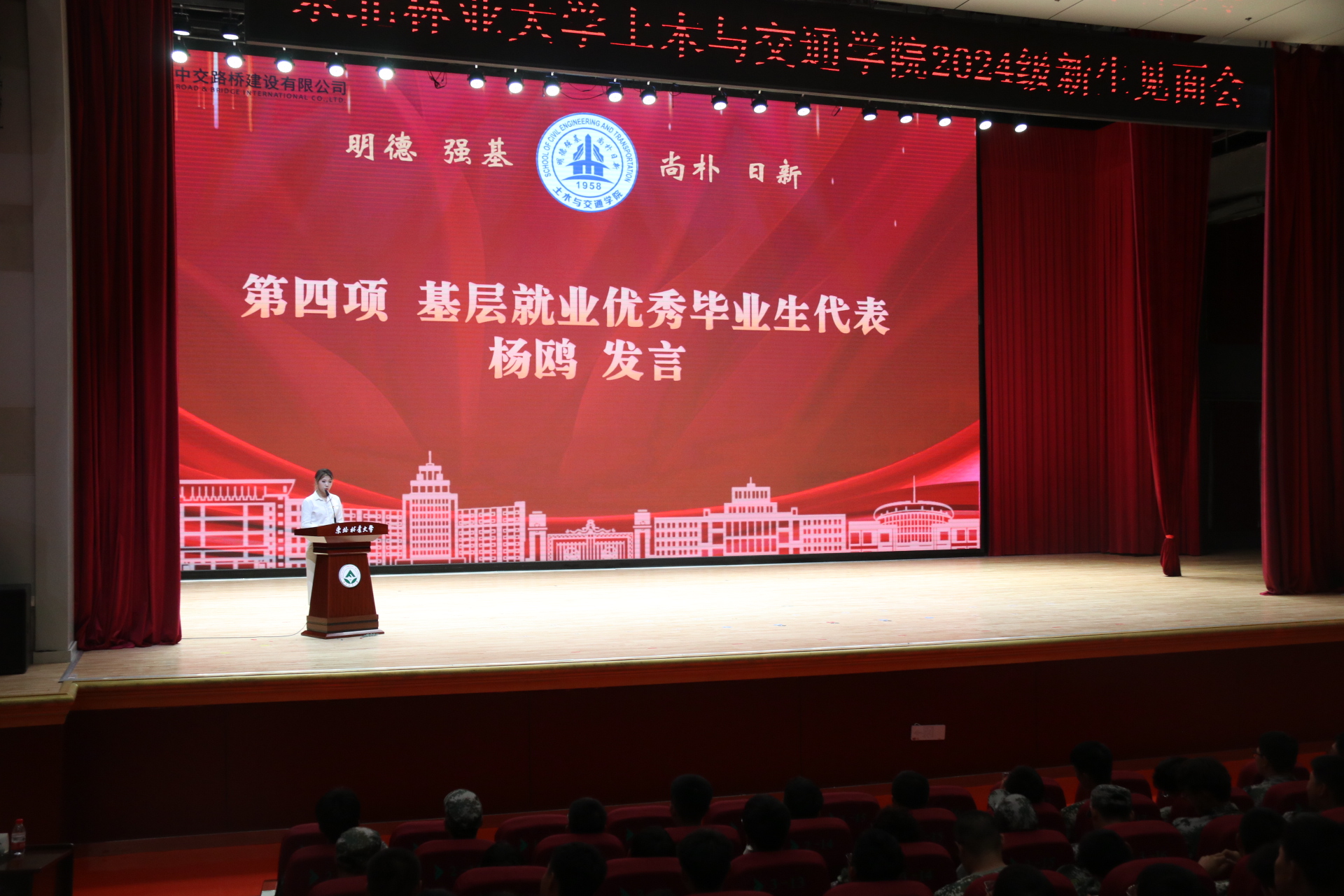 近三年基层就业优秀毕业生代表、中建三局华东公司杨鸥学姐也同样现身说法,为学弟学妹们介绍了自己在东林的本科生活,她希望每位新生都可以尽情地享受大学丰富多样的平台,珍惜宝贵的四年,享受自己的青春。接着杨鸥学姐又对自己的一年基层工作生活进行介绍,分享了自己在基层工作的经历与收获。号召更多学子奔赴基层,贡献青春力量。