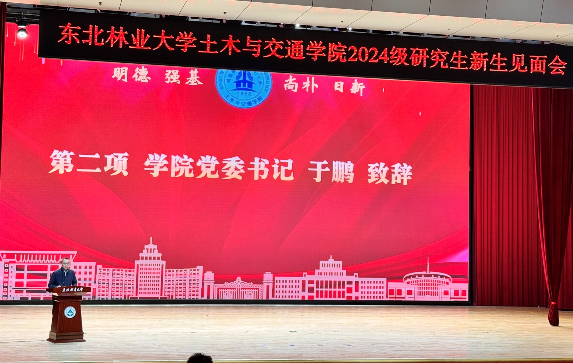 学院党委书记于鹏代表学院向新生的到来表示热烈的欢迎。于书记表示,研究生是未来科技创新的主力军,是国家战略人才的后备军,是教育强国建设的先锋队,要更加突出钻研探索,突出精通突破突出审辩式、建构式、创新型的学习。于书记对新同学们提出了三点希望:一是希望同学们胸怀理想,心系国家。二是希望同学们增强对东林的认同感、归属感。三是希望同学们能正确认知自我,养成自律习惯。