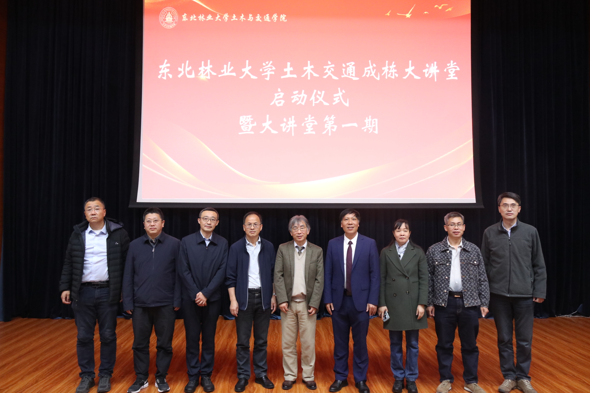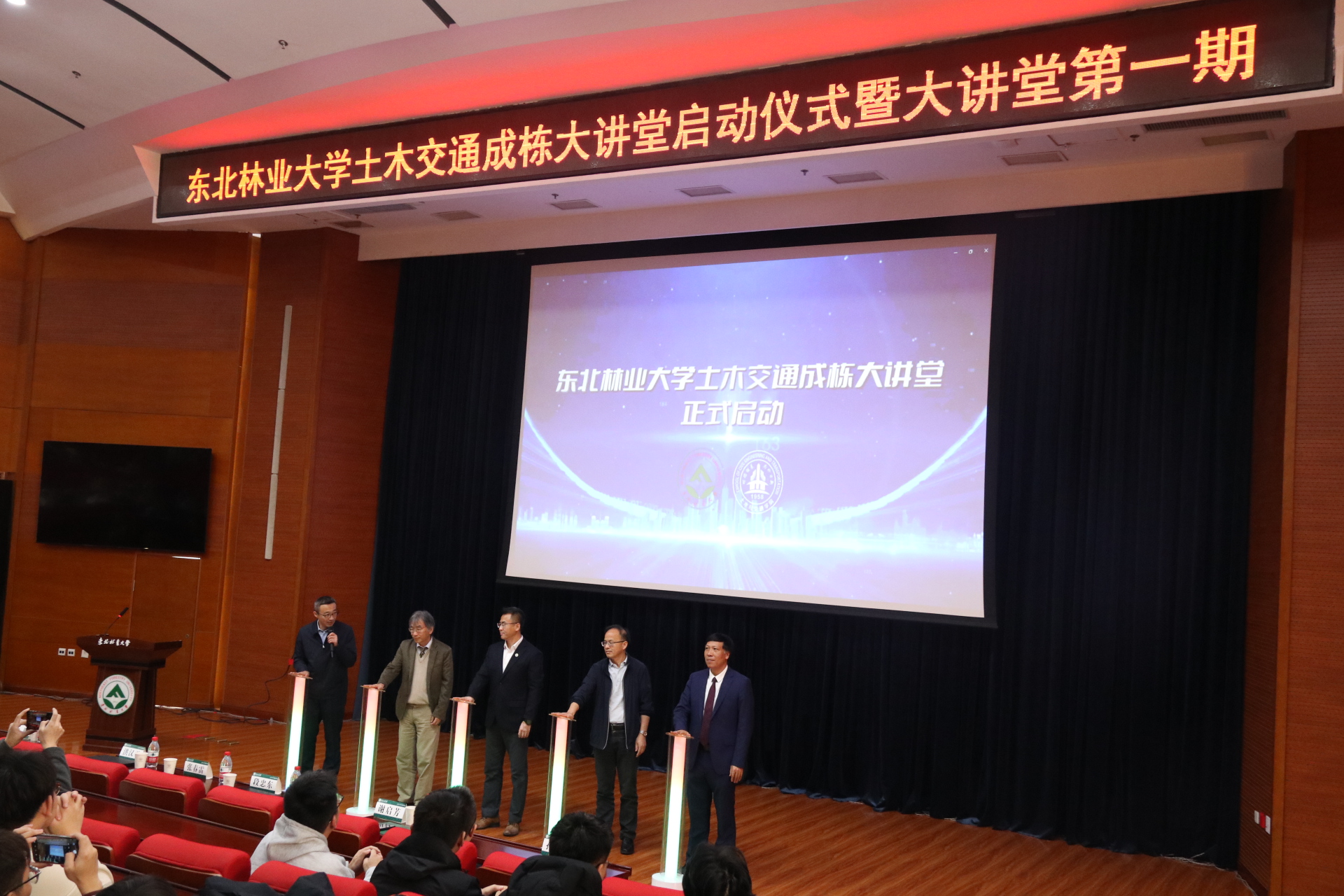 紧接着,张春雷校长、洪汉平教授、段忠东教授、谢启芳院长、于鹏书记共同完成了“土木交通成栋大讲堂”启动仪式。在全场热烈的掌声下,大讲堂第一期讲座正式开始。