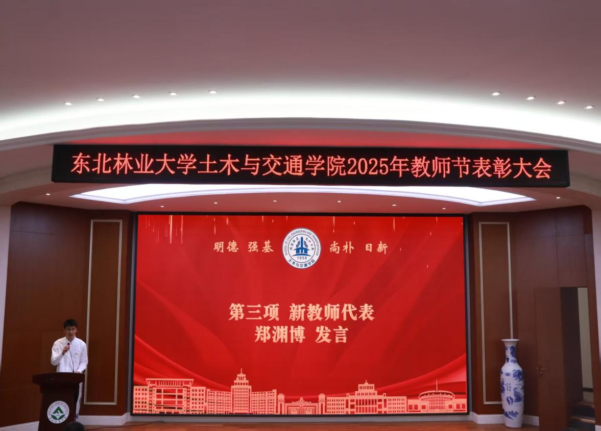 在职教师代表刘金亮分享从教感悟,作为土木交通领域的教育工作者肩负重大责任,并高度赞扬学院所有教师的奉献精神,为学生们在各类学术竞赛和国家建设中取得的卓越成就感到自豪,承诺将继续深化教学改革,培养适应未来的创新型人才,为谱写学院新篇章贡献力量。