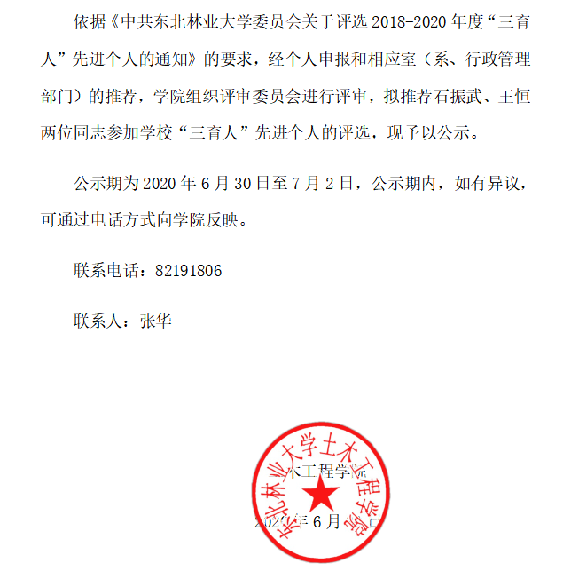 关于土木工程学院拟推荐参加学校“三育人”先进个人评选的公示