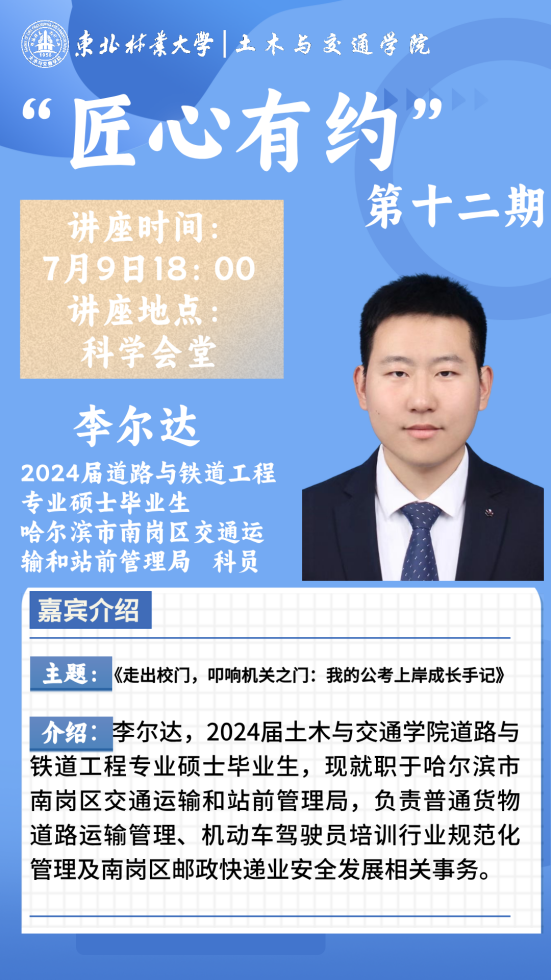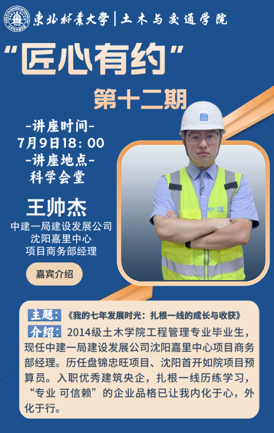 为助力同学们深入了解职场生态,激发同学们探索职业可能性的内在动力和意识,树立同学们主动规划未来的积极态度,同时促进理论与实践的深度融合,Betway体育西汉姆联特邀哈尔滨市南岗区交通运输和站前管理局李尔达和中建一局建设发展公司沈阳嘉里中心项目商务部经理王帅杰,为同学们带来“匠心有约”第十二期专题讲座。此次讲座旨在通过两位嘉宾丰富的职场经验,为同学们点亮职业发展的灯塔,拨开人生职业规划的迷雾,指引大家迈向理想职业的征途。